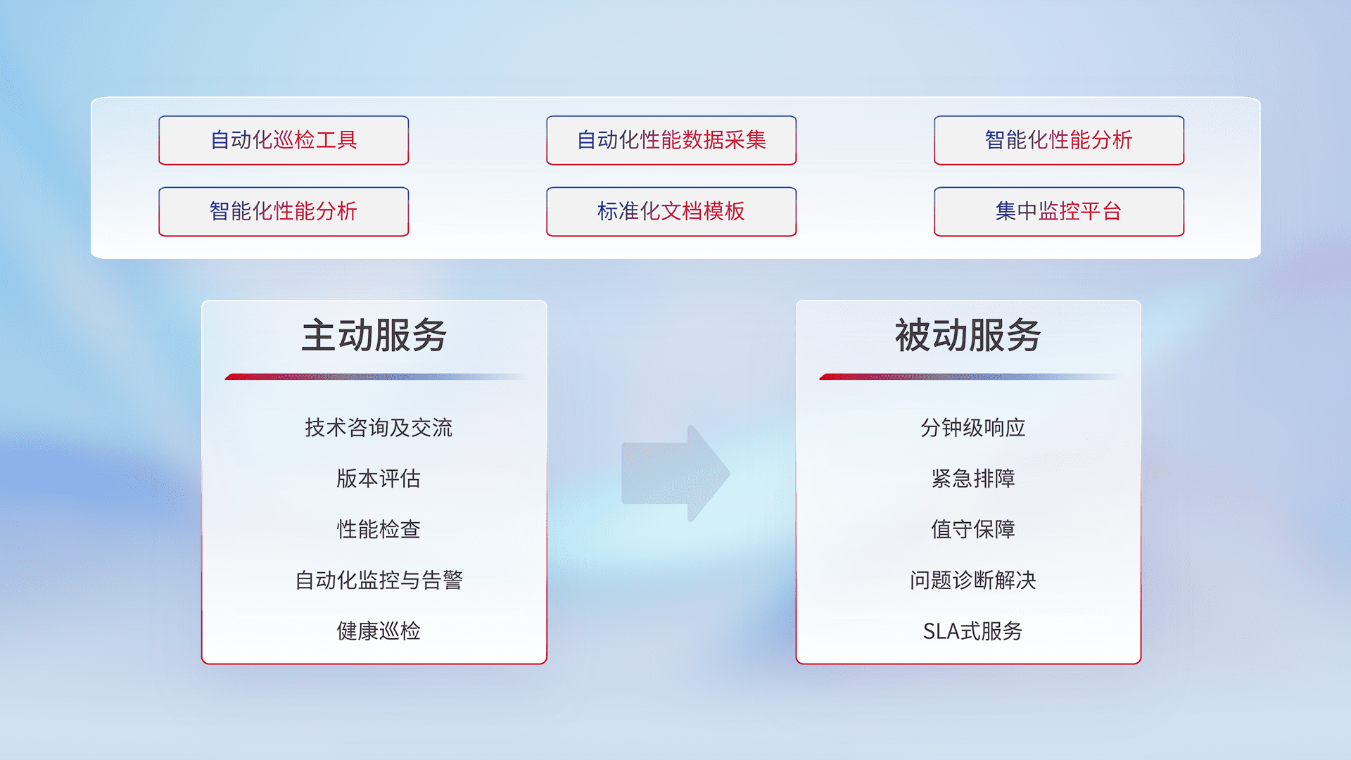 智能化工具和标准化文档,,,保障服务质量,,提供主动服务(包含技术咨询、、版本评估、、性能检查、、自动化监控与告警、、健康巡检)和被动服务包含(分钟级响应、、、紧急排障、、、值守保障、、问题诊断解决、、SLA服务)。。