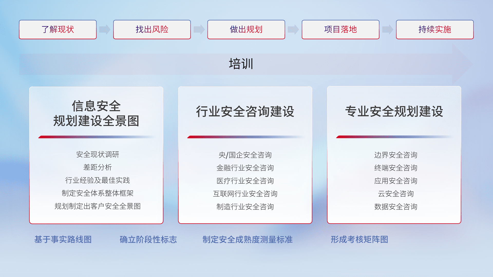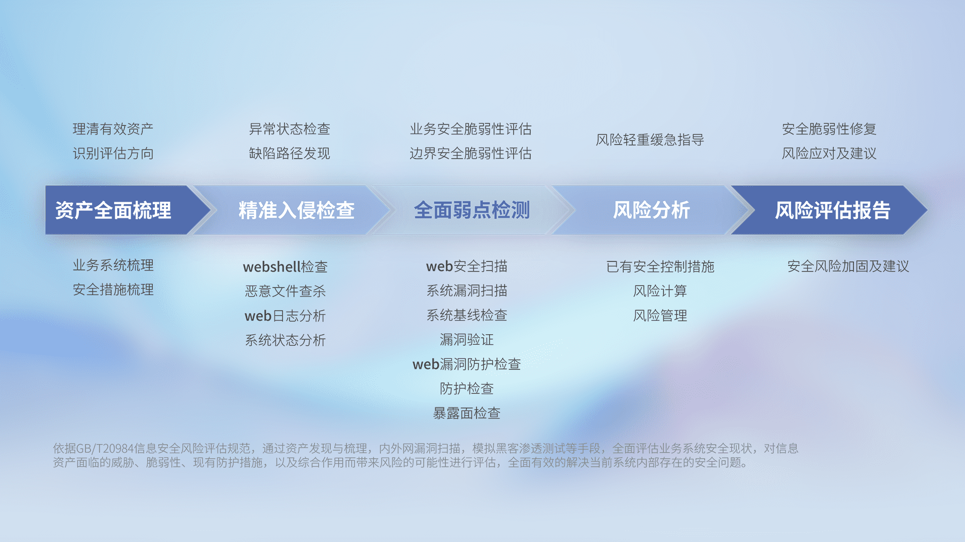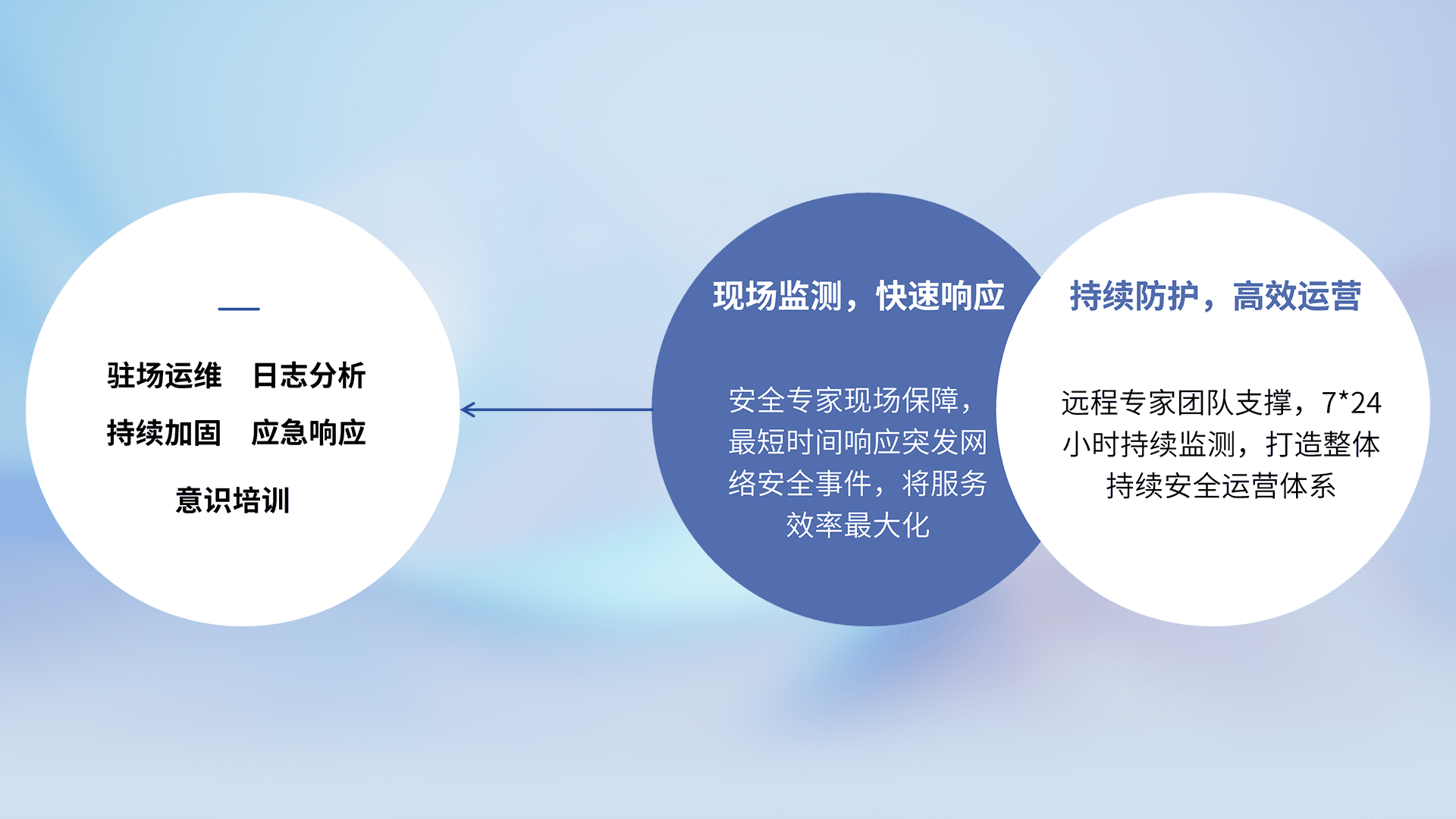 针对客户行业特性,,,以专业的安全服务+多厂商联合解决方案提供专属的一站式安全管理服务,,帮助客户全面感知网络空间威胁,,,基于识别、、、检测、、、、分析、、防护、、、监测、、响应的服务理论模型,,,从方案咨询、、集成交付、、、评估验证、、、优化加固、、、运维运营,,致力于为客户提供完整的闭环管理式安全服务。。以实战经验为客户打造高抵御风险的安全体系,,,,帮助客户发现威胁、、、、对抗威胁、、、处置威胁,,不断积累安全对抗能力,,,持续保障数字化安全。。。。